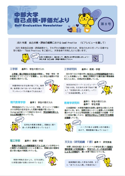 中部大学では、学生のための内部質保証となるよう、大学内における点検・評価への理解を深め、充実させるべく「自己点検・評価だより」を発刊しています。