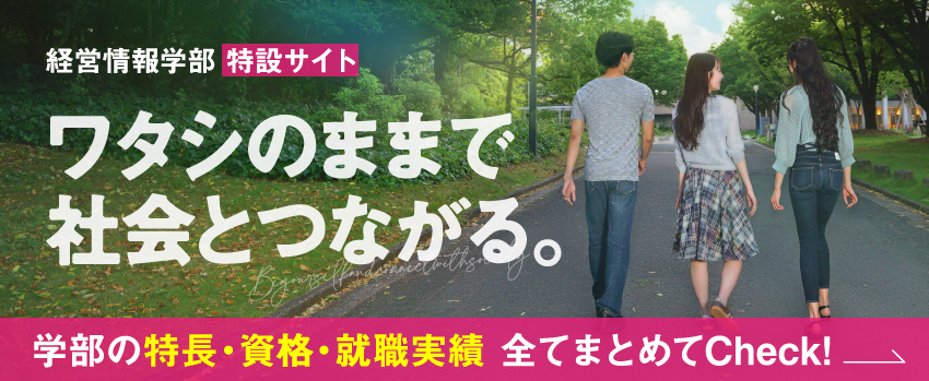 経営情報学部では、AIやビッグデータの活用が進む高度情報化社会において、経営・情報・会計・経済・法律などの諸分野を幅広く理解し、自立心、公益心、考察力、行動力を持ち、あらゆる分野・業種の発展に貢献できる人間の育成を目指しています。