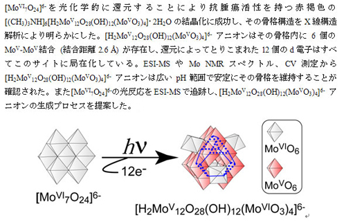 ポリ酸とは数個から数百個のモリブデンやタングステン、バナジウム等の金属原子が酸素原子と規則正しく配列して構成される分子状金属酸化物クラスターです。反応系のpHや共存イオンなどをコントロールすることでさまざまなサイズや骨格構造を持つポリ酸が形成され、それぞれの特性に基づいて触媒や発光材料、医薬など広い分野で応用されています。本研究室では光化学反応を用いたポリ酸の合成や構造化学、その物性評価を行っています。