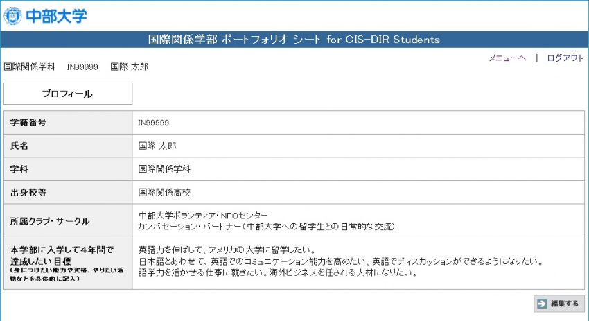 国際関係学部ポートフォリオの画面イメージです実際のものはこれと異なる場合があります
