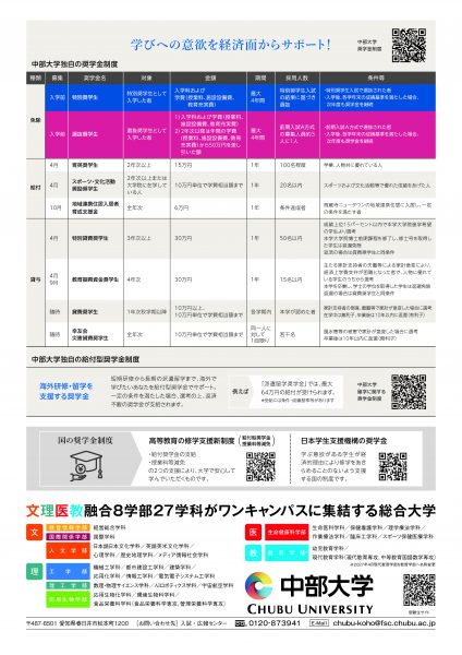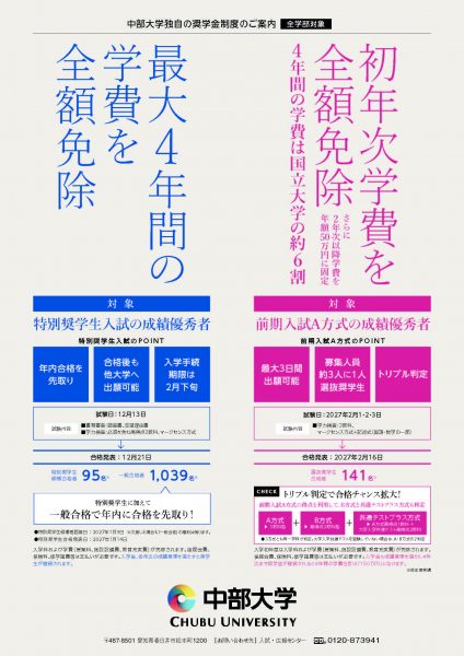 特別奨学生として選ばれると、入学料および最大4年間の学費が免除されます。また、特別奨学生に選ばれなくても、一定の学力を有すると認められた者を一般合格者として選抜します。専願の入試で本学に既に合格している方も、同一学科(専攻)に限り出願できます。