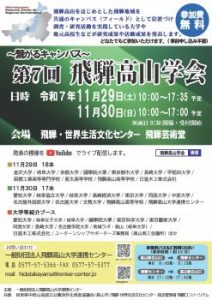 飛騨高山をはじめとした飛騨地域を共通のキャンパス(フィールド)として調査研究活動を実践している大学や大学生、地元の高校生、そして地域住民が集い、研究成果・活動成果を発表する飛騨高山学会を開催しています。