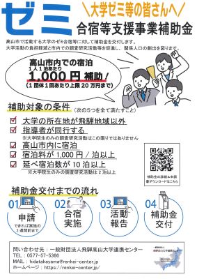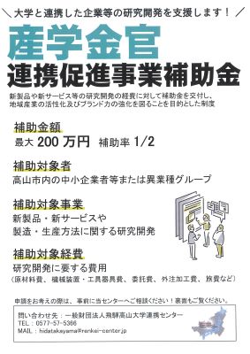 中部大学と連携・協力の協定を締結している高山市より補助金の案内がありました。