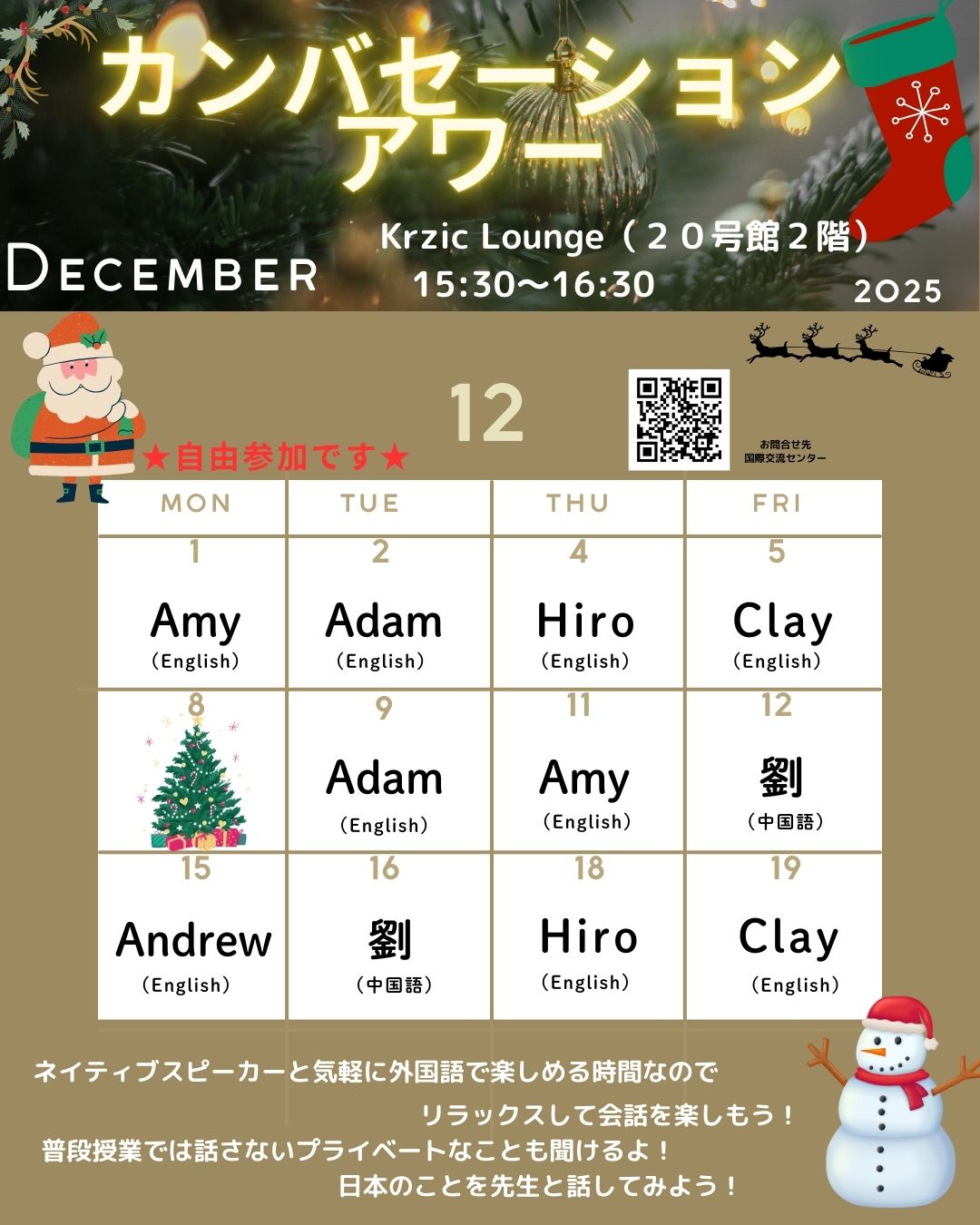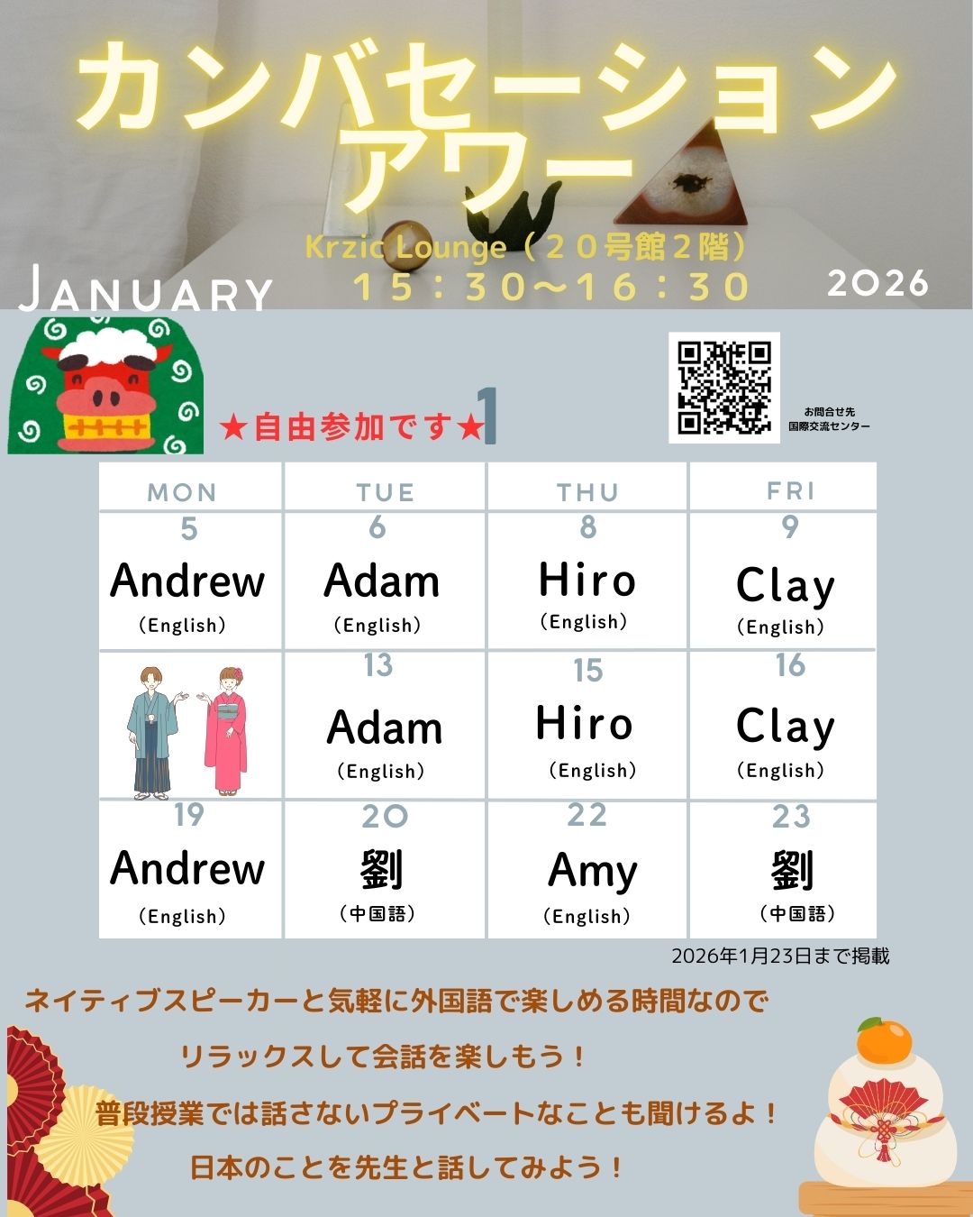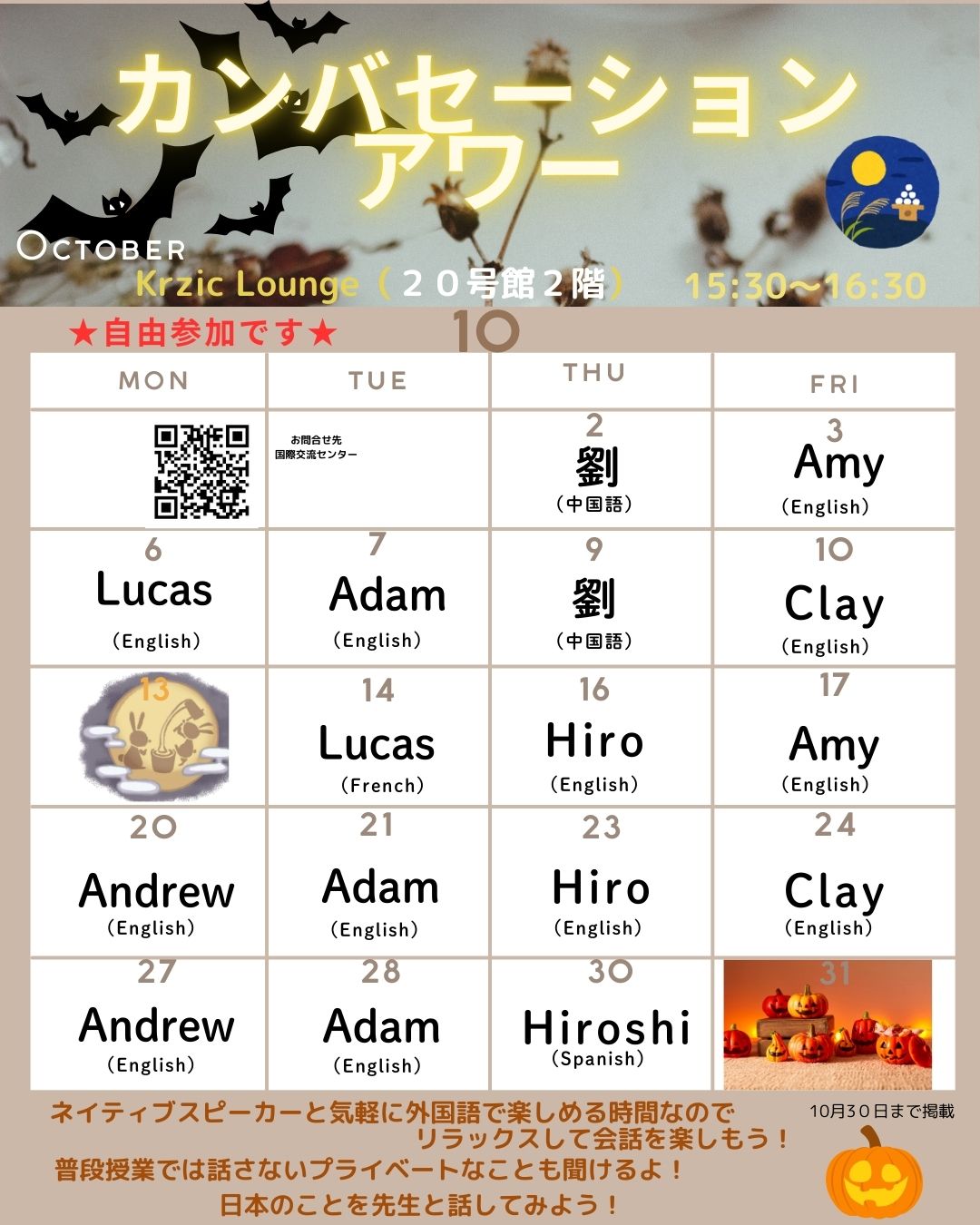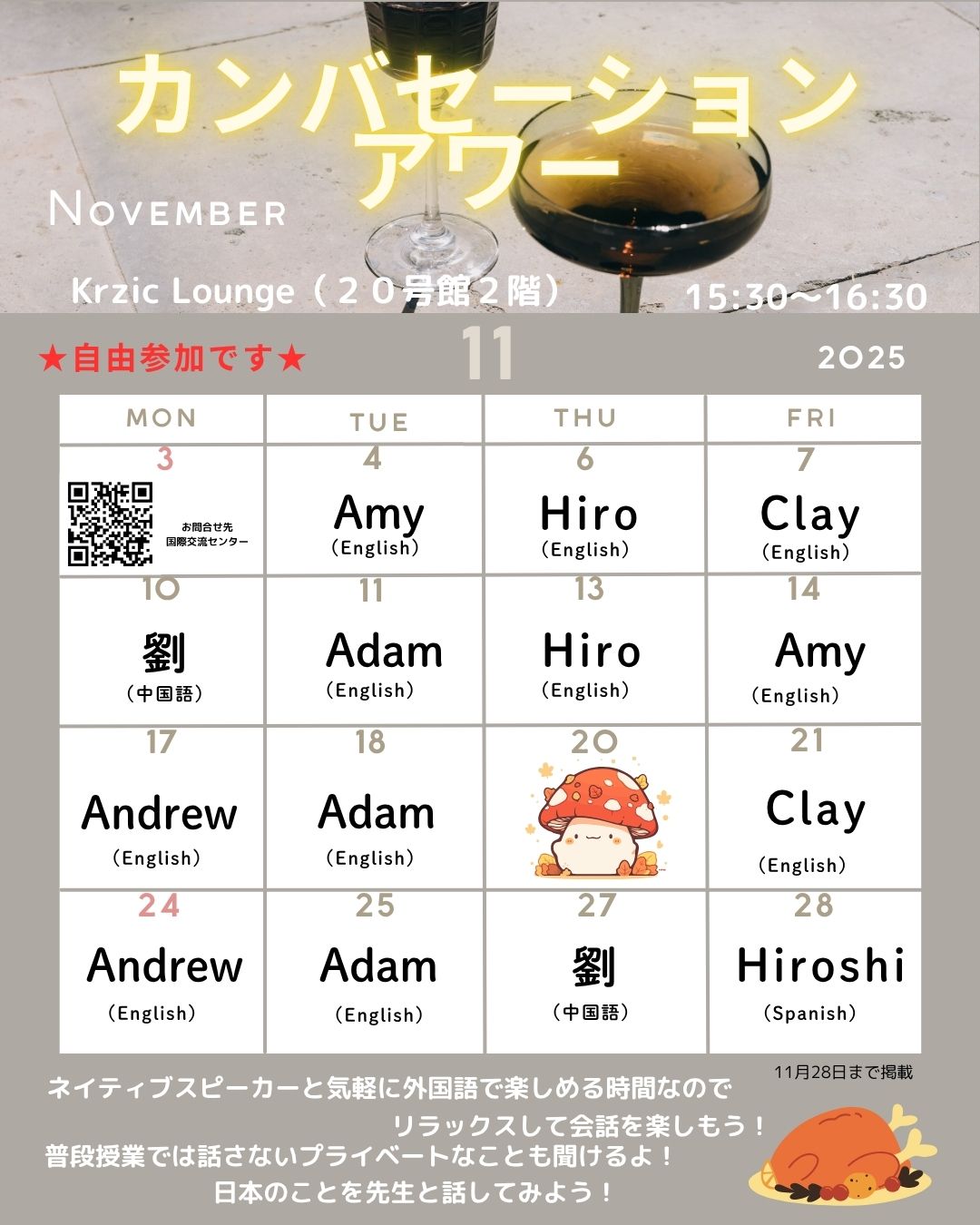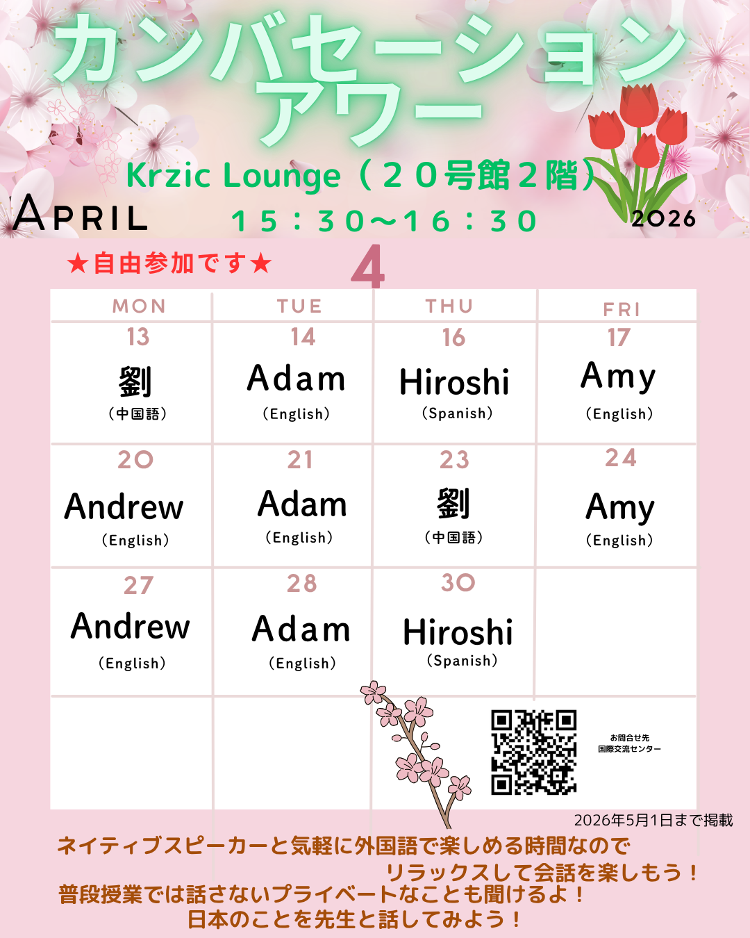 - 開催予定日、担当ネイティブは毎月初めにホームページ、Language Lounge横の掲示板にて発表します。