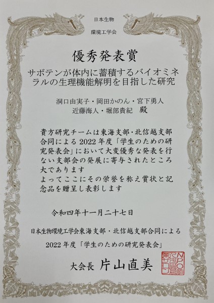 洞口由実子さん(環境生物科学科4年生、堀部貴紀研究室)が2022年11月26・27日に開催された日本生物環境工学会東海・北信越支部合同支部大会「学生のための研究発表会」で優秀発表賞を受賞しました。