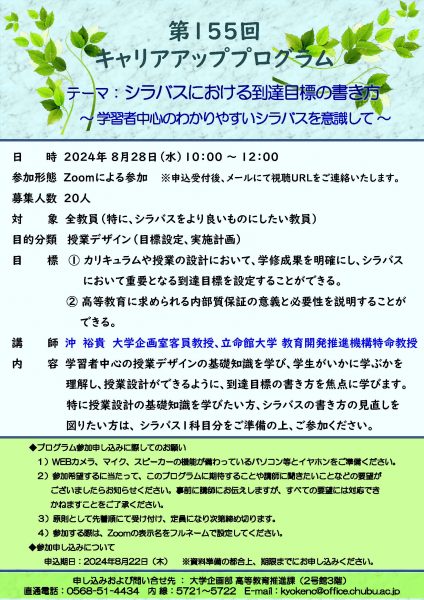 第155回 キャリアアッププログラム【シラバスにおける到達目標の書き方 ~学習者中心のわかりやすいシラバスを意識して~】を開催しました。
