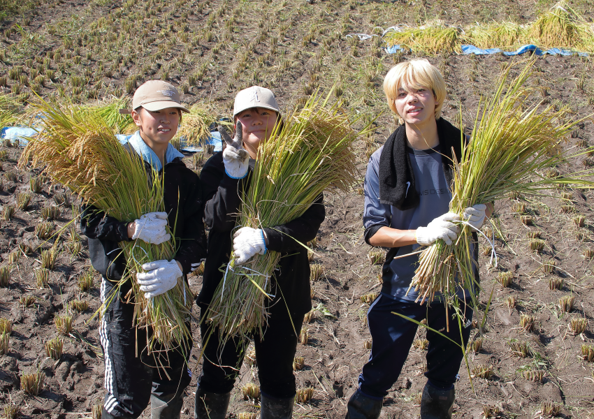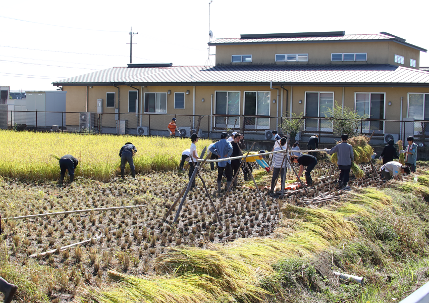 2024年10月12日(土曜日)に、応用生物学部実習農場にて、毎年恒例の稲刈りが行われました。秋晴れのもと、食品栄養科学科管理栄養科学専攻の2年生と、農場サポーターズクラブのメンバーが、皆で爽やかな汗をかきながら楽しく稲を刈りました。