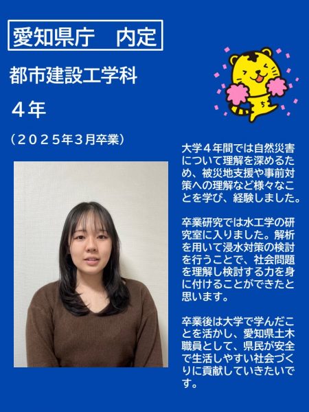 卒業後は大学で学んだことを活かし、愛知県土木職員として、県民が安全で生活しやすい社会づくりに貢献していきたいです。」