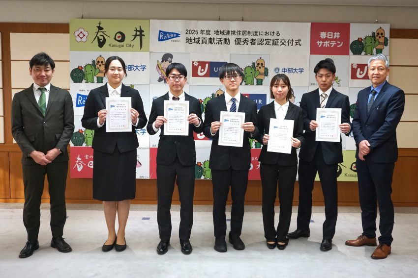 2025年4月16日に春日井市役所において、2025年度地域貢献活動優秀者認定証交付式が開催され、地域連携住居に入居し、高蔵寺ニュータウンの活性化推進に寄与したと認定された学生に、石黒直樹春日井市長より地域貢献活動優秀者認定証が授与されました。