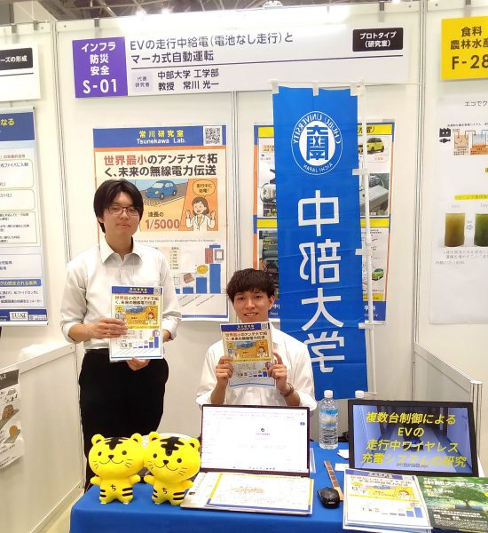 S-01ブースにて、「EVの走行中給電(電池なし走行)とマーカ式自動運転」についての展示およびピッチプレゼンテーション(22日開催)を行いました。