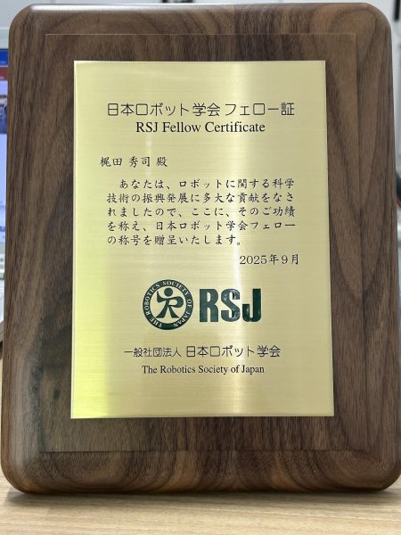 2025年9月に梶田秀司先生のこれまでのロボットに関する科学技術の振興発展への貢献が認められが日本ロボット学会のフェローの称号が認定されました。