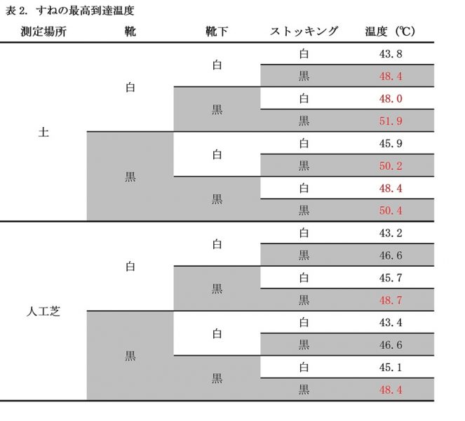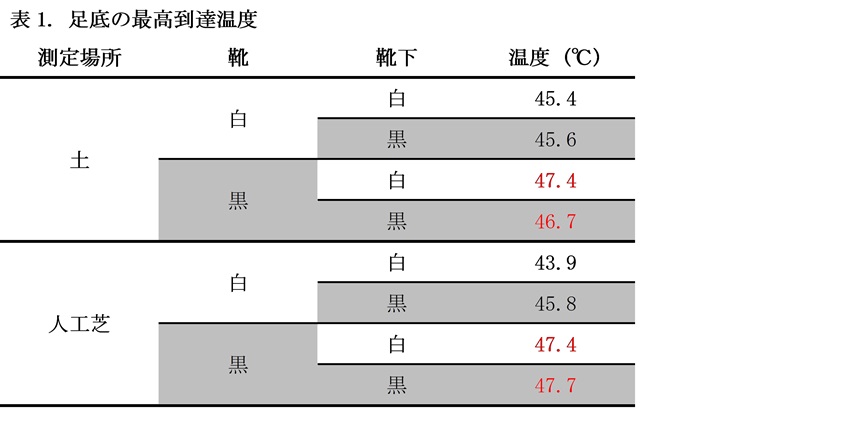 その結果、マネキンの足底とすねの表面温度はすべての条件下で上昇した。土のグラウンドでは、すべて黒色の衣服(靴、靴下、ストッキング)を着用したマネキンの足底温度は45℃を超え、すねの温度は50℃を超えた。一方、すねの温度が最も高かった衣服の組み合わせは、白い靴と黒いストッキングを着用した時であった。
