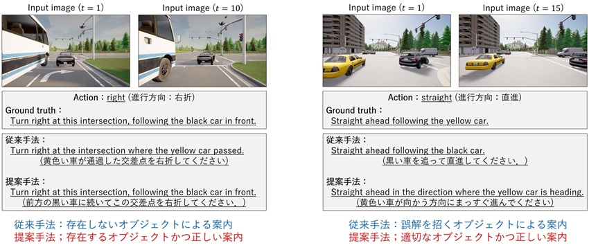 - 進路に応じて重要な物体に注目した言語による案内文生成と、AIが「どの車を見て案内しているのか」を視覚的に説明することでより信頼性の高い運転支援を実現。
