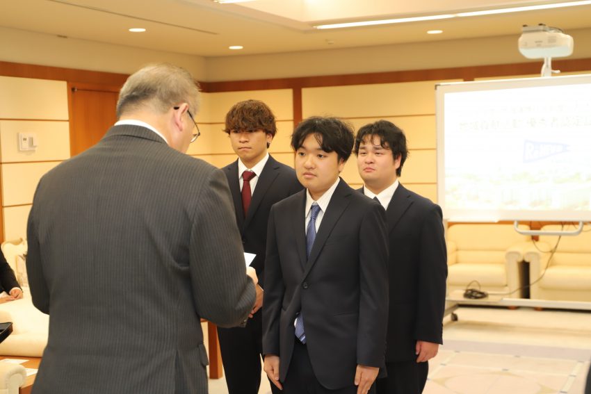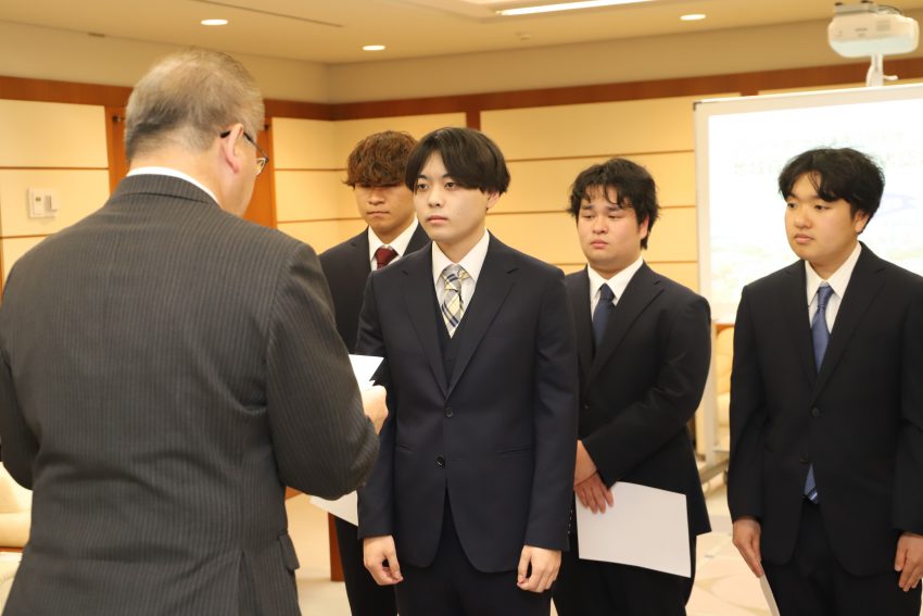 認定は、地域連携住居の制度において特に顕著な地域貢献活動の実績を有する学生に対して行われるもので、交付式には本学からは梅嵜周毅学生部長、宮内俊幸学生部長補佐らと対象学生が出席しました。