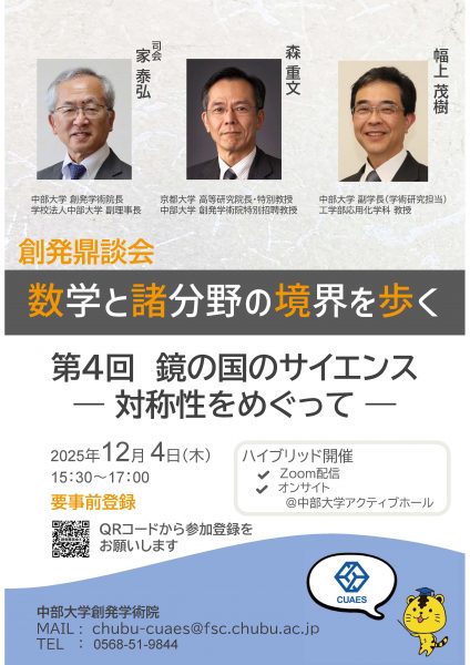 第4回創発鼎談会では、数学、化学、物理学の第一線で活躍してきた3名の研究者が、それぞれの専門の立場から「対称性」と「非対称性」の奥深さと魅力を語ります。