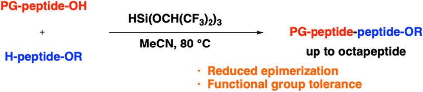 In the context of peptide bond formation, the condensation of peptide fragments facilitates parallel synthesis, thereby streamlining the process and representing an efficient strategy that is unique to liquid-phase chemistry. However, this approach often results in epimerization of the stereocenter adjacent to the activated carboxylic acid due to the formation of oxazolones. The epimerization-free formation of peptide bonds is therefore crucial for the synthesis of peptide drugs. In this study, peptide bonds were formed between peptide fragments with minimal epimerization using HSi(OCH(CF3)2)3 as the silylating reagent. This method was applicable to various peptides bearing diverse functional groups and enabled the synthesis of octapeptides. This strategy holds potential for application in pharmaceutical drug development and in the synthesis of bioactive natural products.