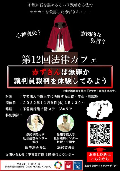 2022年11月9日(水曜日)、不言実行館2階スチューデント・コモンズにて、第12回法律カフェ「赤ずきんは無罪か裁判員裁判を体験してみよう」を開催しました。
